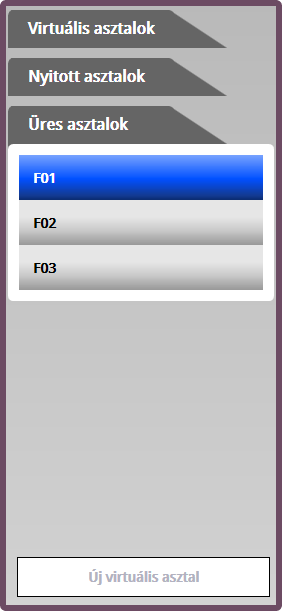 • Lehetőség van olyan asztalok létrehozására, amelyek nem kerülnek fel az asztaltérképre konkrét asztal formájában, csak a Virtuális asztalok listába.