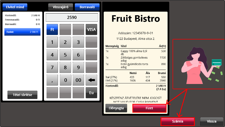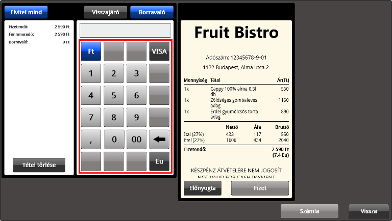 A gombok segítségével kezelhetővé válik a többletként begépelt összeg borravalóként vagy visszajáróként.